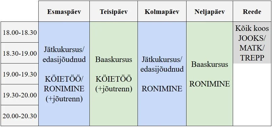 Kõik trennid (välja arvatud jooks/trepp) toimuvad Ronimistehase köiesaalis (Tehase 23, Tartu), kui ei ole teisiti teavitatud.