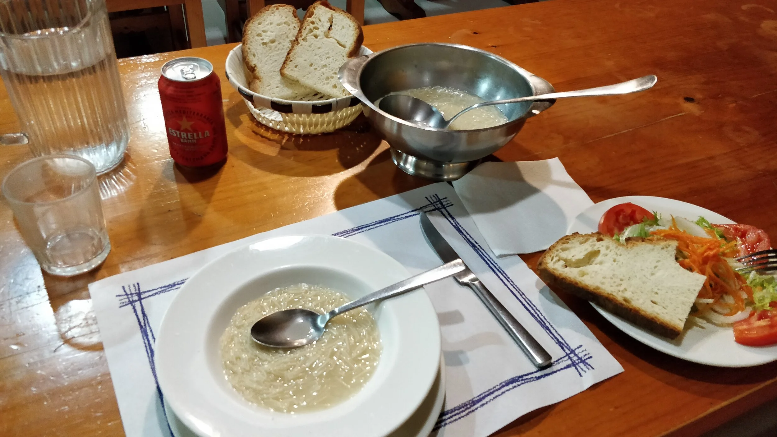 Julgeksin pakkuda, et umbes tunni pärast sain oma esimese kinnituse, et olen õigel rajal, kui märkasin taamal esimest suunaviita. “1 km ja 45 min La Renclusa hütini” oli seal kohalikus keeles kirjas, kui mälu ei peta. Mulle sobis. Edasine oli üsna sündmustevaene, mõni südame põksuma panev libastumine järsemal nõlval ja tugevnev lumesadu, aga tunni pärast jõudsin hütti 2140 m kõrgusel. Seal võtsid mind vastu 2 röökivat koera. Tegin julgelt sõprust ja seadsin sammud üllatavalt suurde hütti. Jäätunud saapapaeladega mässates ilmus uksele ebanormaalselt rõõmus keskealine mees, kes katsus õrnalt käega mu biitsepsit ja ilmselt uuris, kes ma olen ja kust tulen. Vehkisin kätega hispaania keeles vastu, et mul on siin broneering ööseks. Selle peale juhatas ta mu järgmise kohaliku juurde, kellega õnneks sai inglise keele peale üle minna. Kell oli küll 21:00, aga erandina lubasid nad mu ikkagi erandkorras ära toita. Töötajad olid väga-väga vastutulelikud ja rõõmsad, siiralt kiidan teenindust. Isegi 5 min sooja vett lubati ja, kuna rahvast oli vähe, sain lausa privaatse narivoodeid täis toa. Rõõmujoovastus, et saan pesema, taandus peagi, sest tuli välja, et käterätik ei olnud leidnud teed mu 33-liitrisesse seljakotti… Ega’s midagi, marssisin oma uhke õlipatsiga söögiruumi, kus ootas #fitlife salat, nuudline nuudlisupp, paar saiaviilu ja väljateenitud õlu. Kõik väga omal kohal.