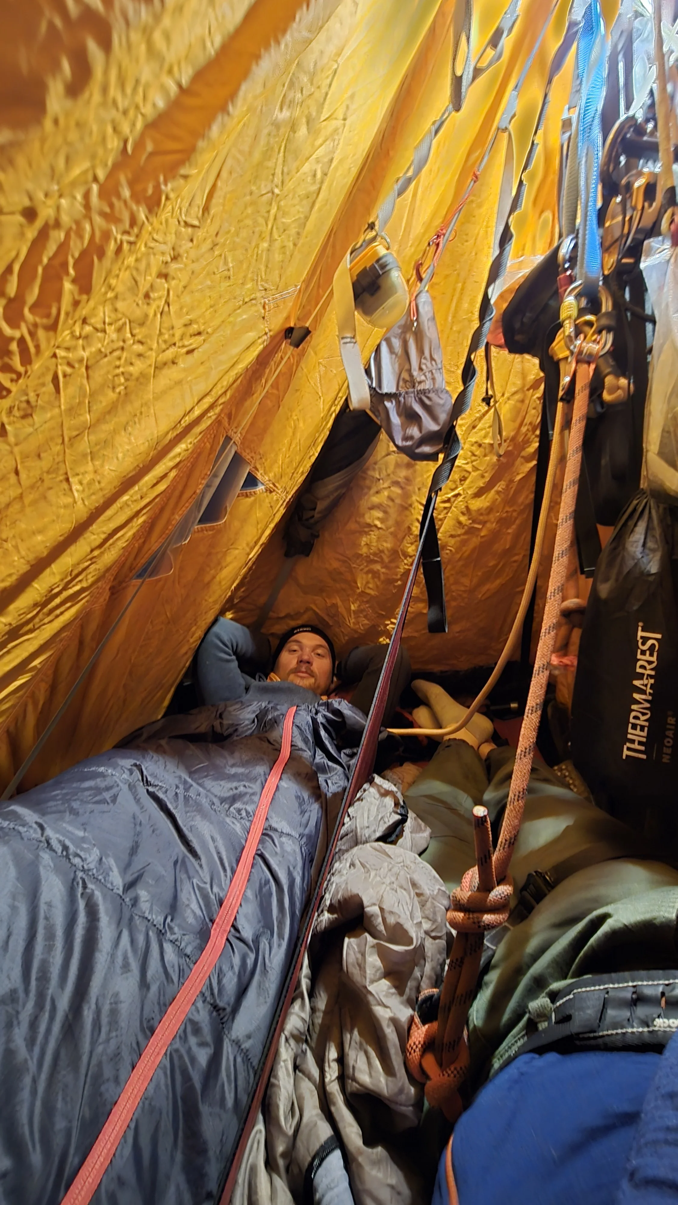 Portaledge’is liikumine on üsna keerukas - kahekesi ühel küljel seistes võib see end tagurpidi keerata. Seepärast tuli selle peal asjatades hoida tugevat distsipliini ja kõik liigutused läbi mõelda. Ja seepärast peavad ka kõik asjad olema kinnitatud - nii padjad, magamiskotid kui ka gaasipõleti olid nööriga telgi külge kinni seotud.